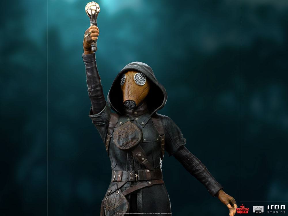 Sie trägt ein rustikales Lederkostüm mit Kapuze und eine Gasmaske und hebt ihren technologischen Befehlsstab, der ihr Macht und Kontrolle über die kleinen Kreaturen verleiht, die bescheidensten und verachtetsten von allen, genau wie ihr Vater es ihr beigebracht hat. Die Gasmaske dient sowohl dazu, ihre Identität zu verbergen als auch sie vor dem Geruch der Kanalisation zu schützen, in der sie ihre Rattenarmee rekrutiert. Mit zwei ihrer kleinen Verbündeten zu ihren Füßen präsentiert Iron Studios die Statue „Ratcatcher II – The Suicide Squad – BDS Art Scale 1/10“ auf einem Sockel, der einem Waldgelände im südamerikanischen Inselstaat Corto Maltese ähnelt. Sie hat die Mission, ein Gefängnis und Labor namens Jotunheim zu zerstören.