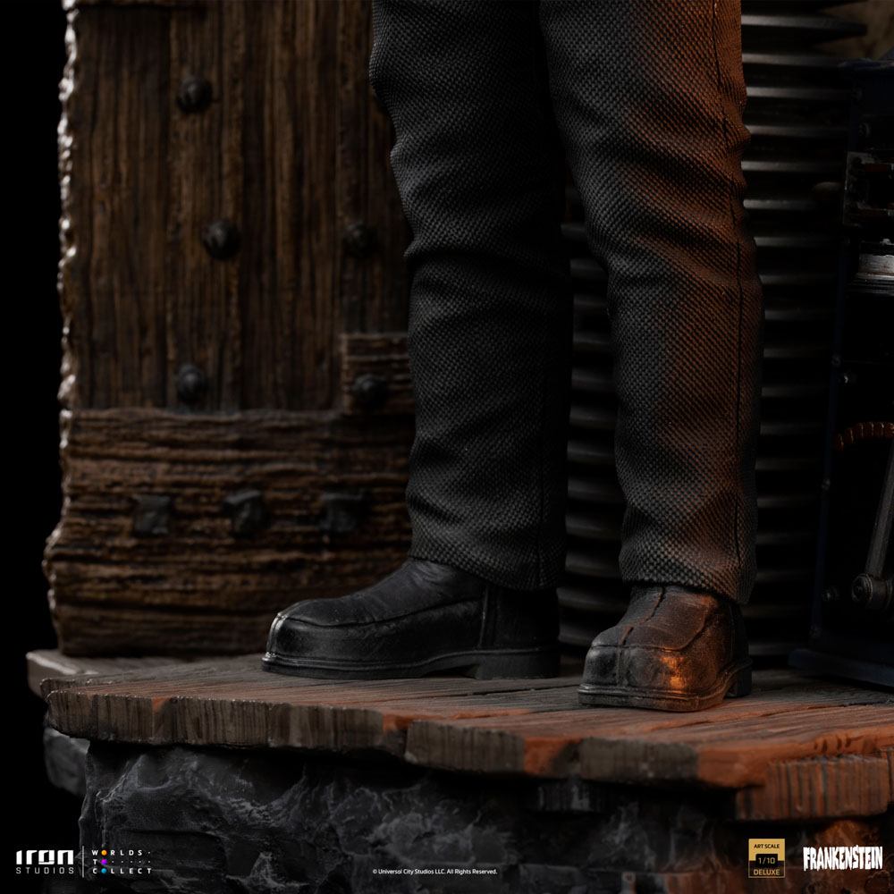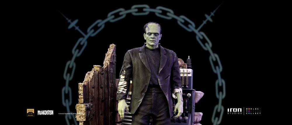 In a laboratory hidden inside a medieval tower near a village in the Bavarian Alps, a monstrous giant is revived through the science of manipulating the forces of nature, is freed from his captivity in the dungeon, and begins the discovery of a world so unprepared for his existence as he is to the world itself. Grotesque in appearance, gifted with monumental strength and limited intellect, his most primitive survival instincts make him a mortal threat to the men who fear him and seek his destruction. Seen as a violation of the laws of nature and creation, in a primitive society unprepared for his existence, he was born and was soon seen as a monster, known by the name of his creator. Derived from one of the most classic horror films from Universal Studios, Iron Studios brings the statue "Frankenstein's Monster Deluxe - Universal Monsters - Art Scale 1/10", with the infamous monster in a diorama set next to a variety of equipment and electrical devices that brought him to life, and next to the heavy and broken wooden door of the dungeon, above the rustic and old wooden floor of the medieval tower where he was born.